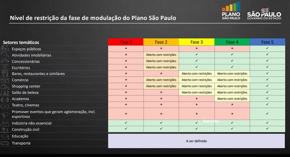 Chamado de “Plano São Paulo”, propõe a retomada consciente de algumas atividades em cinco etapas. As regiões do estado foram classificadas em fases por cor, de acordo com os critérios definidos pela secretaria estadual da Saúde e pelo Comitê de Contingência para Coronavírus.