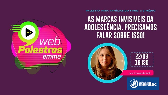 O Ciclo de Palestras Movimento Somos pela Vida, em parceria com a Somos Educação – Plataforma de Ensino Eleva, conta a com Web Palestra da Fernanda Aoki para pais de alunos do ensino fundamental anos finais e ensino médio, no próximo dia 22/08, às 19h30, em nosso Web Canal da Escola.